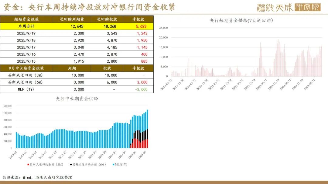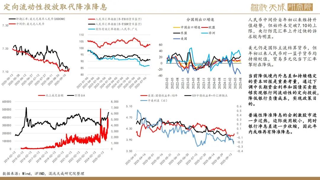 定向流动性投放取代降准降息。美联储年内或再有2次降息,人民币汇率稳步回升,当前甚至面临升值过快的压力。但人民币升值主要以美元为主,对一篮子货币升值幅度有限,在贸易对象多元化的当下,汇率的掣肘在降低;当前境内资本市场作为两国博弈的重要一环,降低境内外息差和持续稳定的资本回报是重要考量,后续或难有普遍性的降准降息,但我国仍需要低利率环境和稳定的升值预期,后续银行间流动性预计维持每月净投放,同时短端利率的下限将打开。