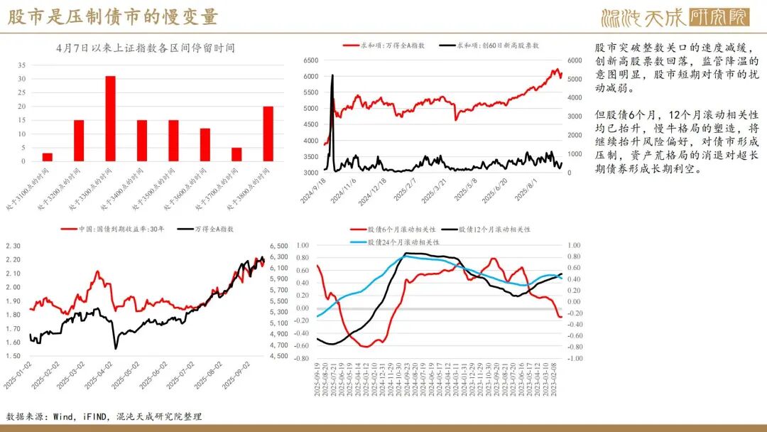 股市是压制国债的慢变量:股市突破整数关口的速度减缓,短期对债市的扰动减弱,但慢牛格局的塑造,将继续抬升风险偏好,对债市形成压制,资产荒格局的消退对超长期债券形成长期利空。