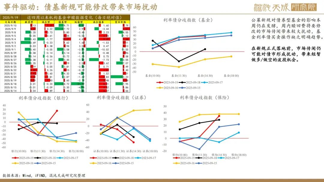 事件驱动:债基新规将带来短期波动,同时长期将带来债券配置资金的持续减少,后续关注新规修订情况与实际落地。国债新发与续发情况影响市场情绪。