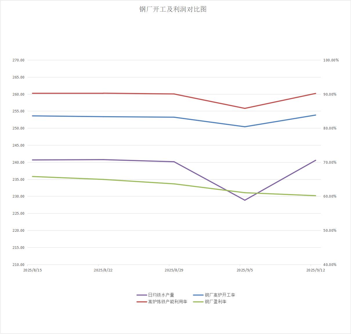 需求方面,截至9月18日,钢厂高炉开工率83.98%,周环比上升0.15%;高炉炼铁产能利用率90.35%,周环比上升0.17%;钢厂盈利率58.87%,环比下降1.3%;日均铁水产量241.02万吨,环比增加0.47万吨;当前样本钢厂的进口矿日耗为297.45万吨,环比增加0.8万吨。本周钢厂钢厂开工情况上升,钢厂利润受原料上行而逐步下滑,下周钢厂复产较多利好铁矿需求,叠加节前补库需求释放,预计下周铁矿需求释放继续增长。