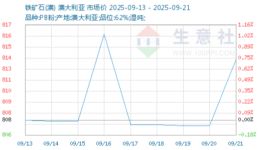 据生意社商品行情分析系统显示,本周(9.13-9.21,下同)铁矿价格先涨后跌,窄幅震荡运行。截至21日,生意社铁矿价格指数为814,环比上行0.74%,具体如上图。本周铁矿价格先跌后涨、小幅上行,其主要原因本周初受国外宏观消息的影响,黑色系行情拉涨,市场交投情绪火热拉涨矿价;后半周随着情绪冷却,市场回归产业逻辑,随着铁矿价格走高,钢厂利润下行,后续可能影响开工情况,所以本周铁矿价格先涨后跌、窄幅震荡。