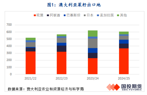 2024年7月至2025年6月,澳大利亚菜籽主要出口至欧盟地区,另外还出口至巴基斯坦58万吨、阿联酋66万吨,在2022-2024年期间日本也是澳大利亚菜籽的大客户。新年度出口预估490万吨,总量小幅缩减,出口对象预计仍在欧盟、巴基斯坦、阿联酋、中国、日本几个选项内。