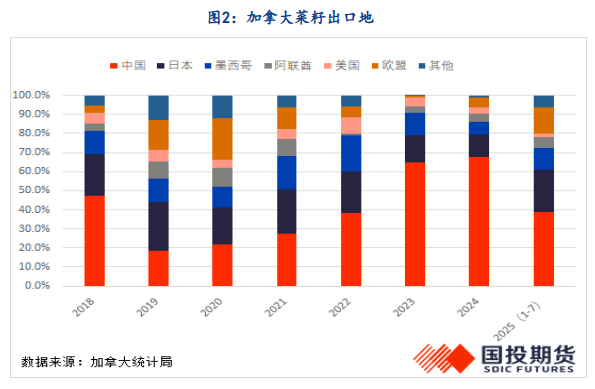 从压榨产能上看,加拿大扩张规模最显著,这主要得益于此前中加菜系经贸往来密切,给予加拿大机会将更多附加经济价值留住。因2025年中国先对加拿大产菜粕、菜油加征100%关税,后对加拿大菜籽进行反倾销调查并加征75.8%的临时保证金,中加菜系贸易几乎陷于停滞状态。加拿大代表团在9月初对中日韩进行访问,意在开拓菜系市场,因中加问题而引发的需求缺口很难在日韩市场弥补,预计加拿大菜籽出口需求或重点开拓欧盟、亚洲其他地区、阿联酋等。从加拿大统计局公布的2025年1至7月出口数据看,加拿大菜籽对欧、日出口已经大幅增长,欧盟占比13.6%,过往三年在1%至6%,日本占比22.3%,过往两年分别为11.6%、14.2%。