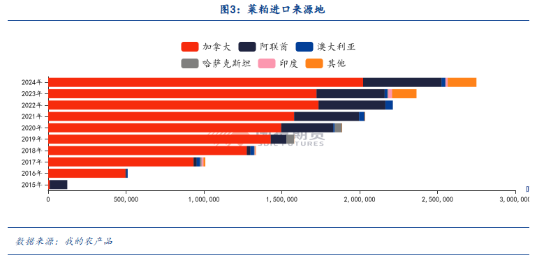 阿联酋的油籽压榨基本是菜籽与大豆,2024/25年度压榨菜籽120万吨、大豆10.5万吨。阿联酋的菜籽压榨产能几乎集中于阿联酋阿布扎比哈利法工业区(KIZAD),最为重要的两家压榨商分别是Al Dahra ACX和Al Ghurair Resources,根据项目启动新闻稿等公开渠道信息统计,此两家压榨商的年产能均在百万吨左右,也即阿联酋菜籽压榨产能在200万吨/年左右,预计新年度阿联酋菜籽进口量与压榨量均将增长,同时中国菜粕进口中阿联酋占比将更高。