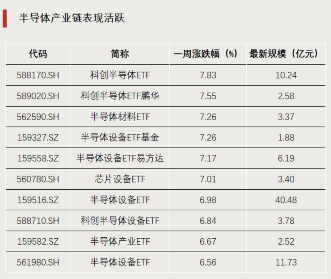 上周(9月15日至9月19日),国内半导体产业链领涨市场,中微公司、中芯国际分别涨超20%、11%,半导体设备ETF易方达(159558)等跟踪的半导体材料设备指数涨超7%。