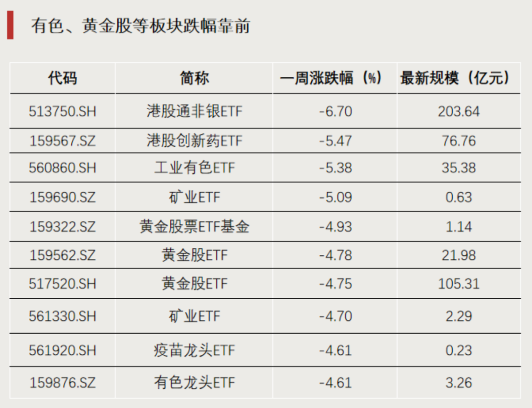 有色、黄金股、稀土以及大金融等板块上周跌幅靠前。其中,港股保险等板块回调,带动部分港股非银主题ETF跌超6%,另有多只有色、矿业、黄金股、稀土、金融、银行等主题ETF跌超4%。