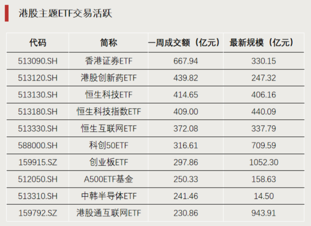 香港证券ETF(513090)上周成交额突破660亿元,已连续11周位居股票型ETF成交额榜首;部分港股创新药、恒生科技主题ETF成交额也在400亿元以上,排在市场前列。