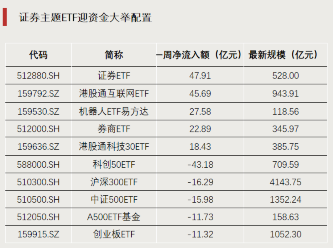 在此前美联储降息预期下,证券主题ETF吸引了大量资金前来布局。跟踪证券公司指数的ETF上周合计净流入超百亿元,香港证券ETF(513090)吸引超12亿元资金净流入。