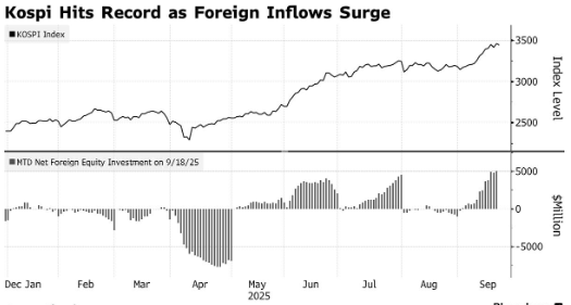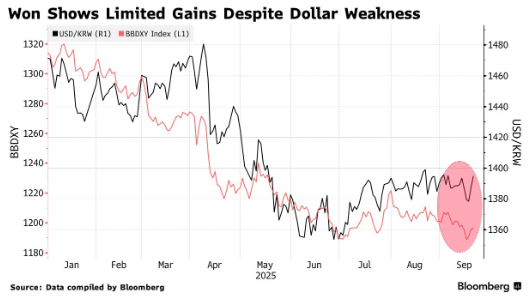 由于与美国的一项3500亿美元的投资协议预计将在未来几年带来巨大的美元兑换需求,韩元正面临压力。该货币本应具备在九月表现强劲的所有条件,比如韩国综合股价指数创下历史新高,外国投资者纷纷涌入,美元因美联储降息而走软——然而韩元却几乎没有变动。花旗和法国兴业银行的分析师指出,美国协议的不确定性是主要的阻碍因素,除了大致的数字之外,关于该协议的具体结构知之甚少。