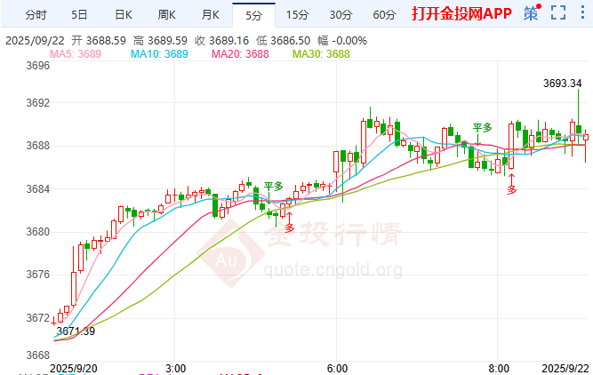 周一(9月22日)亚市早盘,现货黄金震荡微涨,目前交投于3691.78美元/盎司。上周全球黄金市场再度迎来里程碑时刻。上周三(9月17日)美联储降息25基点,现货黄金创新高后震荡回调,周五收于3684.93美元,周涨1.15%,连涨五周显韧性。截至发稿金价最新报3692.88美元/盎司,涨幅0.23%,最高上探3693.92美元/盎司,最低触及3682.79美元/盎司。