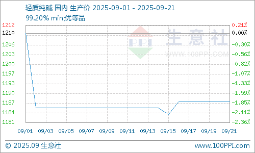 据生意社商品分析系统显示,9月21日轻质纯碱市场均价在1188元/吨,与9月15日价格1184元/吨相比上调4元/吨,涨幅0.34%。