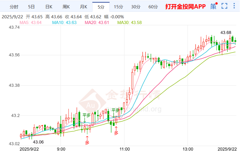 今日周一(9月22日)欧盘时段,现货白银目前交投于43.54一线上方,今日开盘于43.06美元/盎司,截至发稿,现货白银暂报43.63美元/盎司,上涨1.31%,最高触及43.71美元/盎司,最低下探42.99美元/盎司,目前来看,现货白银盘内短线偏向看涨走势。