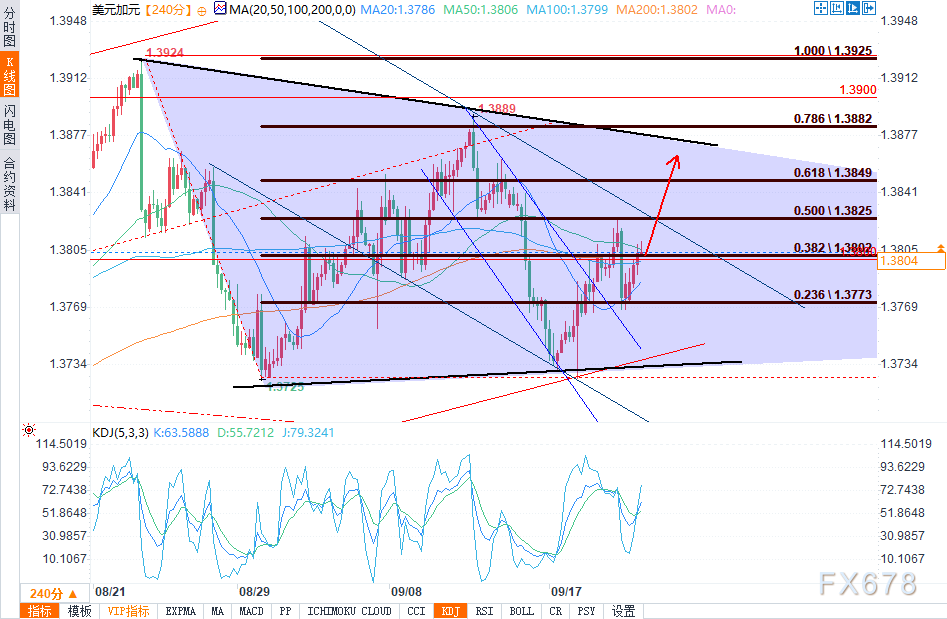 汇通财经APP讯——周一(9月22日),受美联储与加拿大央行货币政策分化的推动,美元/加元汇率仍处于三角形整理形态中。盘中报1.3802,涨幅0.12%。