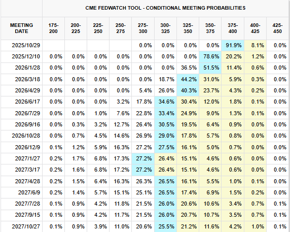 根据芝商所(CME)美联储观察工具显示,目前投资者预计今年还将有两次25个基点的降息,分别在10月和12月,概率分别为92%和79%。