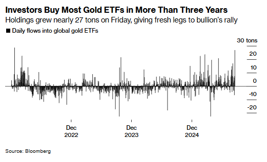 汇编数据显示,上周五黄金ETF资金流入量创下三年高位,价格上涨0.9%创2022年以来最大单日百分比涨幅。今年以来,黄金价格已累计上涨逾40%。