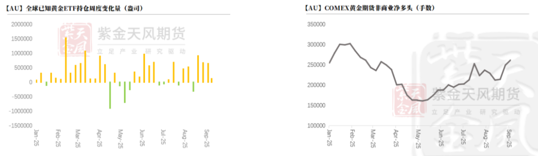 截至9月17日的四周内,全球黄金ETF持仓激增74吨,创4月以来最大连续净流入;同期COMEX黄金期货非商业净多头亦增约4.9万张合约。导火索显而易见——鲍威尔在杰克逊霍尔释放鸽派信号,叠加8月非农就业意外滑坡,美债收益率应声回落。随着美联储降息周期正式启动,年内三次降息已成基准情形,腹部收益率下行仍将是黄金需求的核心引擎。