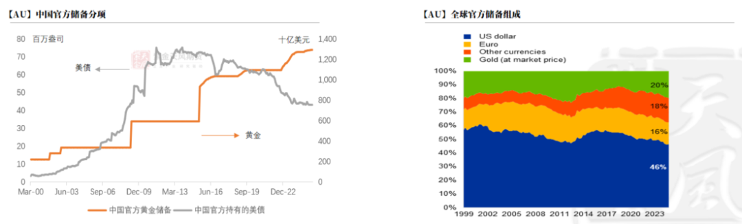 欧洲央行的研究报告《欧元的国际地位》中提到,高金价及新兴市场国家央行的购金行为推动下,2024年底黄金在官方外汇储备中占比达20%,超过欧元,凸显经济与地缘政治因素对央行购金的显著影响。