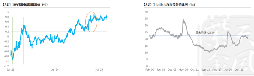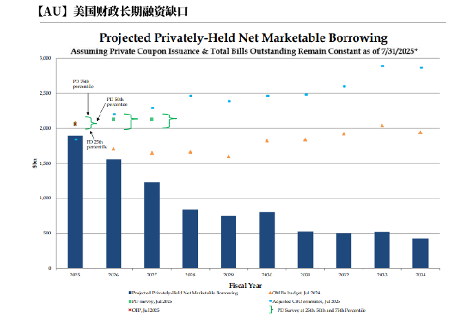 7月的季度再融资会议表明,财政部在未来几个季度内,都保持名义票据以及债券(coupon and notes)的拍卖规模不变,并扩大长期国债的回购计划(buyback),为流动性提供支持。考虑到长端期限溢价水平较高,财政部更多地依赖短债(T-bills)为扩大赤字提供资金,并且在未来仍有一定的操作空间。