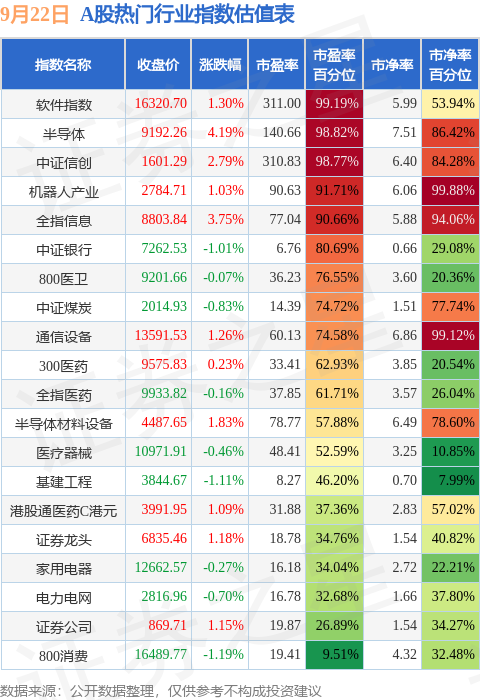 热门行业指数方面,软件指数的市盈率百分位较高,为99.19%。而800消费的市盈率百分位较低,为9.51%。