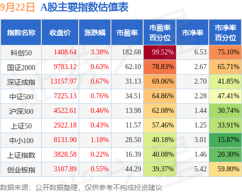 A股主要宽基指数方面,科创50的市盈率百分位较高,为99.52%。而创业板指的市盈率百分位较低,为39.37%。