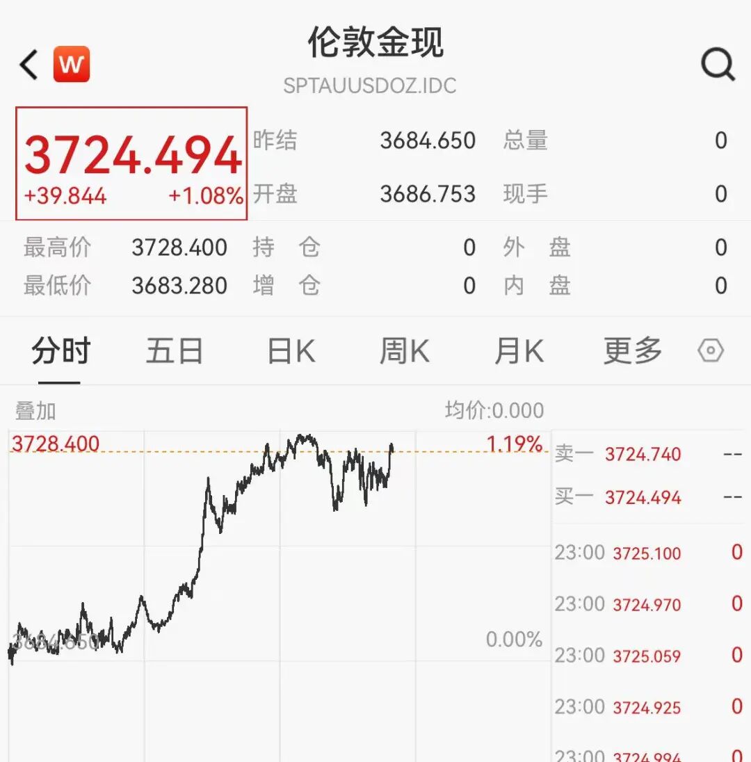 现货黄金一度涨超1%,再创历史新高至3728美元/盎司。