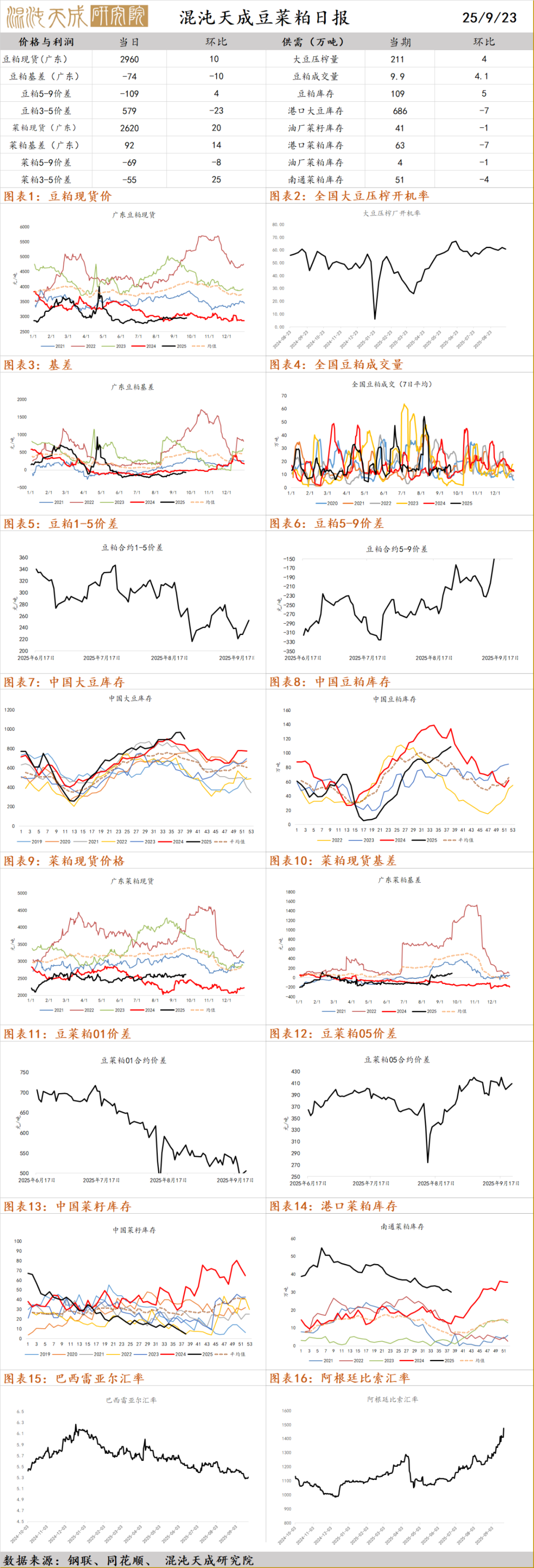 需求端:9月22日,阿根廷政府暂时取消大豆及其衍生品(豆粕和豆油)、玉米和小麦的出口税,旨在增加国内外汇供应,以遏制本币汇率下跌,总统令显示,该措施将持续至10月31日或出口总额达到70亿美元为止,阿根廷是全球最大的豆油和豆粕出口国;加拿大政府将推出一项新的3.7亿加元生产激励计划,以帮助加拿大的油菜籽生产商;美国环境保护署周二发布了一项提案,将小型炼油厂豁免(SRE)计划免除的生物燃料混合义务重新分配给大型炼油厂,并提供了50%和100%两个主要选项,未来45天的意见征集,将成为影响美国能源和农业政策走向的关键周期;据巴西国家能源政策委员会(CNPE)官员,巴西将生物柴油在柴油中的强制掺混比例从14%上调至15%;本周国内库存环比下降3.3%。