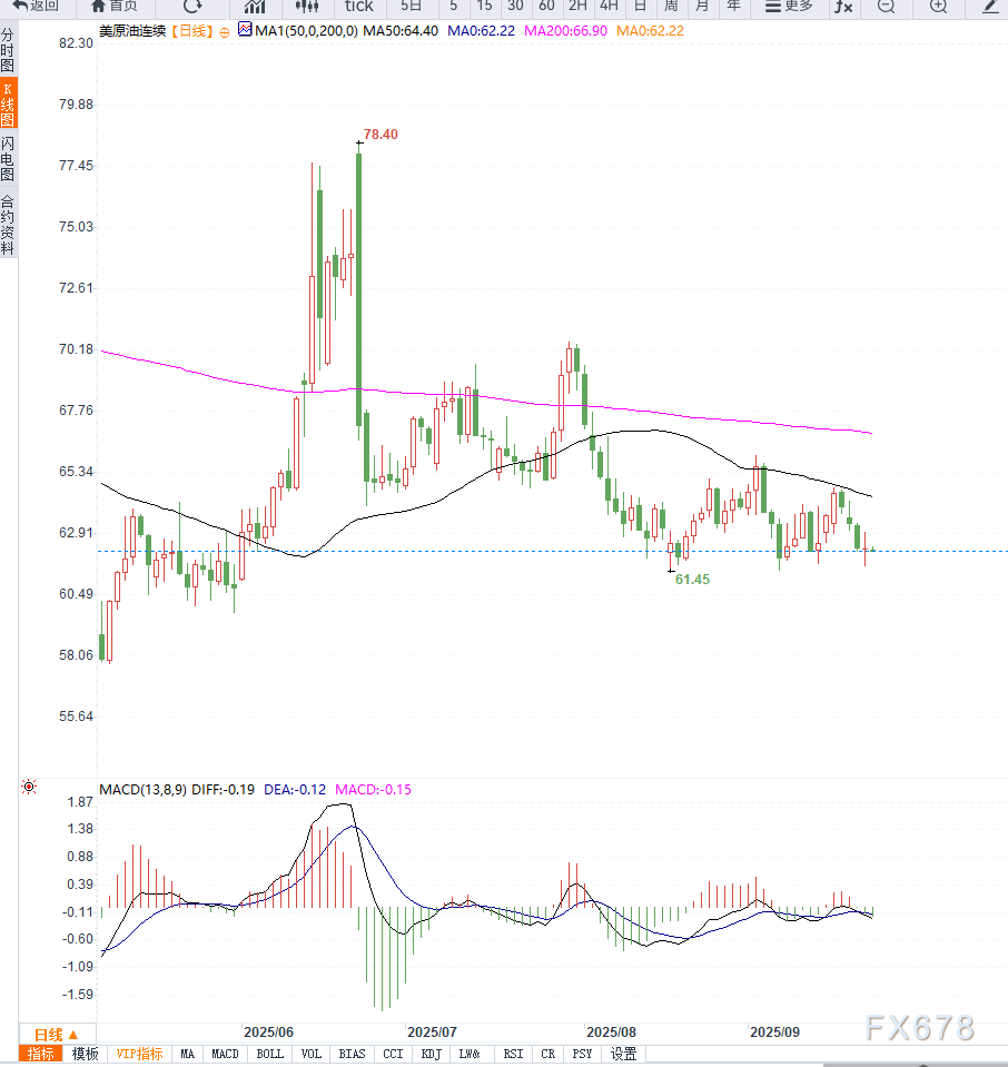 美原油日线图显示价格在连续下跌后于62美元附近获得支撑,短期走势维持在区间震荡格局中。下方60—62美元区间构成重要支撑,若跌破将加大下探压力;