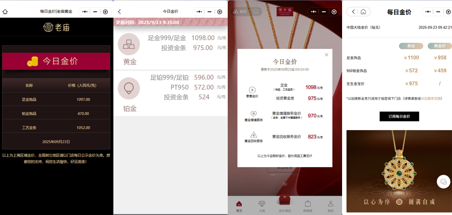 上证报中国证券网讯(记者 曾庆怡)北京时间9月23日,伴随国际金价再度刷新历史纪录,足金饰品价格又一次攀升。当日上午,周生生公布的足金首饰价格达1100元/克。除此之外,周大福足金(首饰、摆件类)、六福珠宝足金999/足金等当日公布的价格升至1098元/克,较一周前(9月16日)的单克上涨11元左右;老庙黄金上海区域足金饰品升至1097元/克,较一周前的单克上涨10元左右。