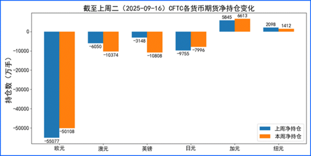 据美国商品期货委员会公布的2025-09-16期货市场头寸持仓报告显示,上周各货币的报告总持仓情况如下:欧元净多头变化4969手,澳元净空头变化4324手,英镑净空头变化7660手,日元净多头变化1759手,加元净多头变化768手,纽元净空头变化686手,上周没有总持仓多空转换的货币。除此之外,单向总持仓变动超过20%的货币有:澳元,英镑。