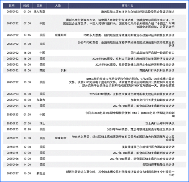回顾上周,美联储议息会议如预期降息25基点,但鲍威尔会后发言透露较强鹰派信号。非美货币方面,日本、英国央行议息会议如预期按兵不动,然而,日元由于日本央行早于预期的风险资产抛售计划而受短线提振。展望本周,全球金融市场将迎美联储静默期结束后的“政策讲话潮”,FOMC官员的密集发声成市场关注核心。同时经济数据方面欧美PMI、美国核心PCE等关键经济数据也将公布,叠加可能的突发舆情,汇价波动或将加大。