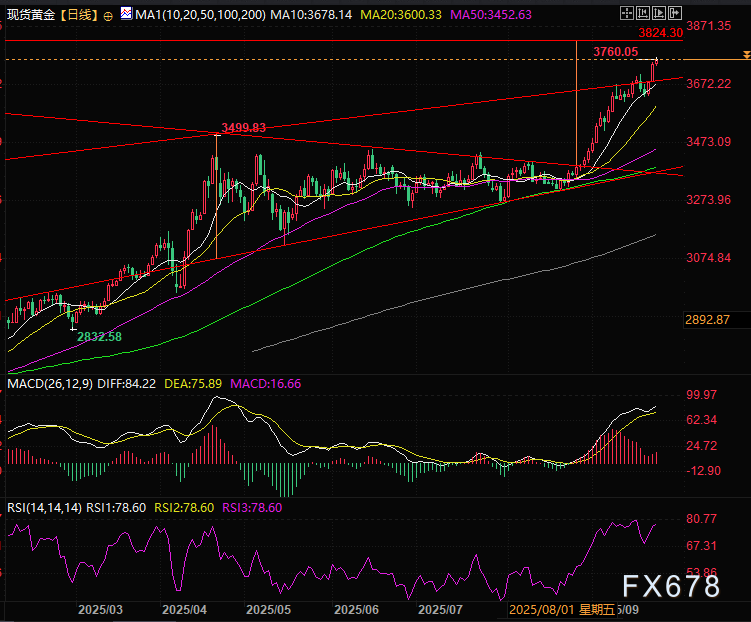 之前文章中技术分析提过,现货黄金如果达到3750,则下一目标是现货黄金三角形大形态的量度涨幅3824,3800附近或会有投资者选择提前获利了结。