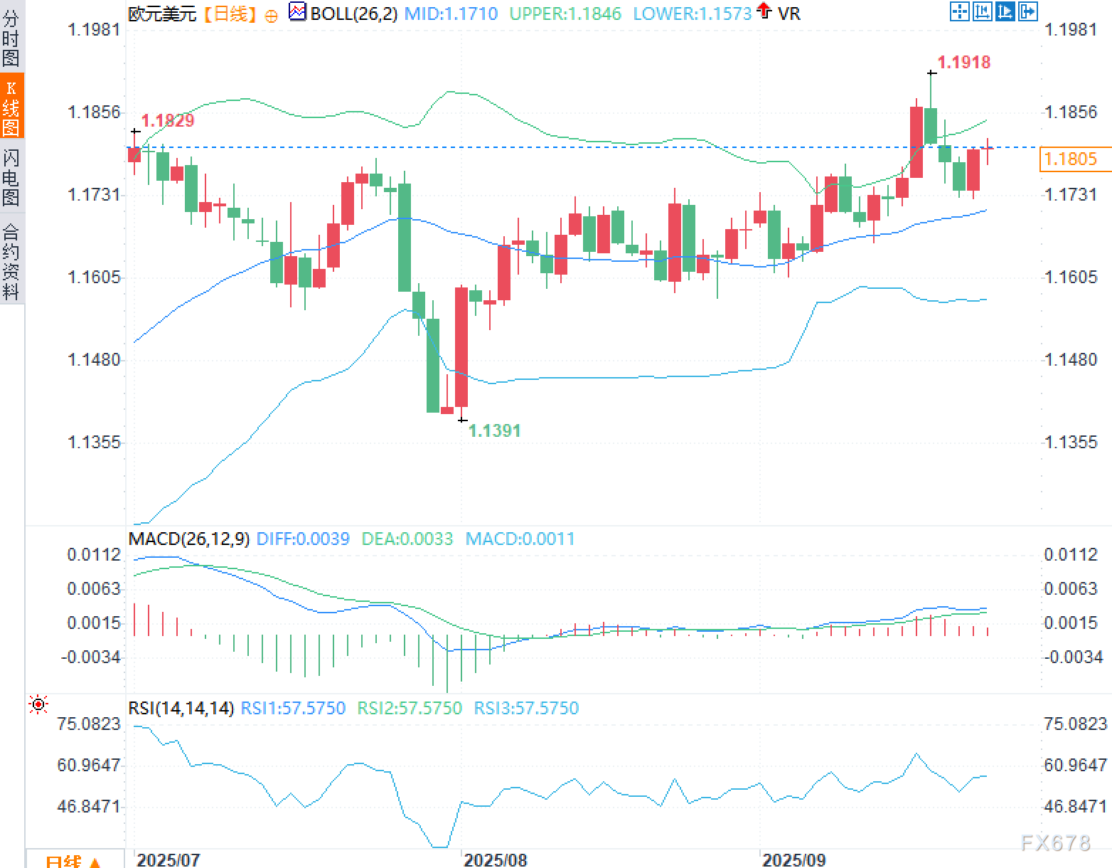 支撑位:1.1800为心理关口与短线枢轴;其下是1.1710(布林中轨/动态支撑),再下看1.1573(布林下轨)。