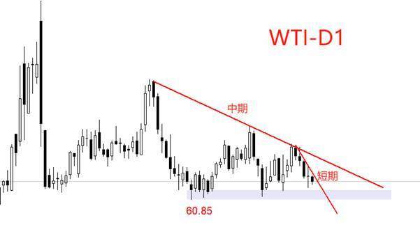 技术走势看,美原油WTI处于中长期空头趋势,但下方存在明显的强支撑区域,K线在60.85紫色区域处形成多重底部。中期趋势线依旧对反弹波段具有压制作用,在该趋势线被有效突破之前,不建议贸然看多。WTI五连跌后形成短期下降趋势线,虽然昨日形成十字星反转结构,但在短期趋势线被破坏之前,跌势仍有望冲击60美元关口。