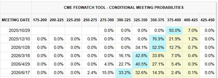 交易员们仍预计美联储将在10月和12月降低利率,尽管本月早些时候已下调了25个基点。目前,根据CME美联储观察工具,市场预计美联储将在10月与12月各降息25个基点的概率分别为93%与77%。