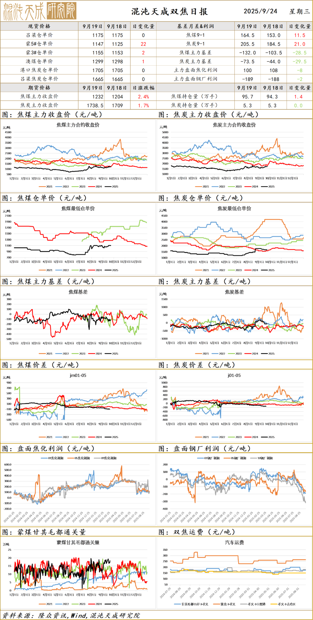 2.中国煤炭资源网冶金部9月23日重点关注:焦炭市场暂稳运行,近日煤价持续上涨压缩焦企利润,部分焦企提出上调基价,目前主产地焦企继续维持当前负荷运行,供应端焦炭产量暂稳,需求方面,短期钢厂在利润支持下继续维持高产,日耗偏强,叠加节前物流紧张,到货略有影响,多数钢厂继续按计划采购。整体看,焦炭供需结构有所收紧,且原料支撑不断走强,主流焦企有提涨预期。焦煤方面,产地多数煤矿维持正常生产节奏,另外个别前期停产煤矿恢复正常,供应端稳中有升。下游方面部分焦企节前补库告一段落,中间环节贸易商及洗煤厂部分开始出货,煤价上涨节奏有所放缓。但因煤矿预售订单较多,煤价整体继续上涨,竞拍市场多溢价成交。进口蒙煤方面,口岸优质焦煤可售资源较少,蒙煤价格继续小幅上涨,蒙5原煤成交涨至1000-1020元/吨左右。