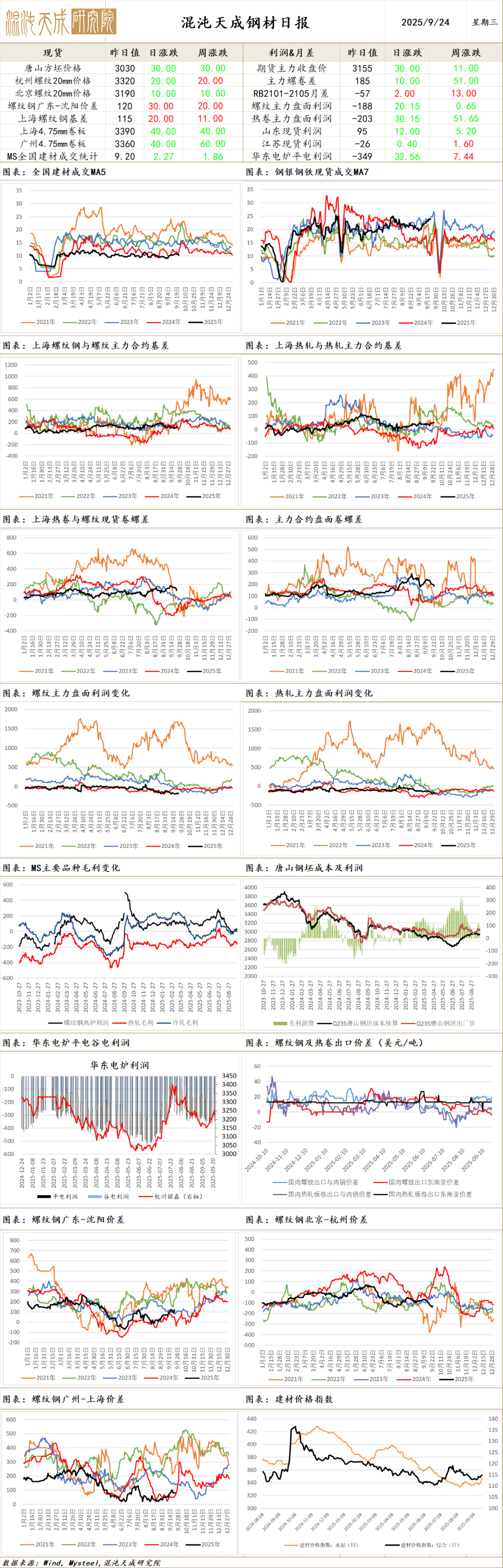 4.唐宋消息:9月23日津冀地区主流钢企铁水不含税成本为2200-2250元/吨,较上周降0-10元/吨,折合钢坯含税成本为2949-2999元/吨。按当前含税普方坯出厂价3040元/吨来算,盈利41至91元/吨。