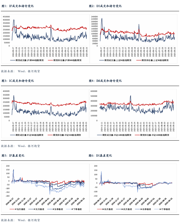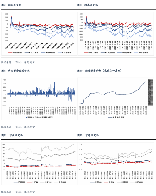 稳定币、地产、旅游、稀土、CRO等跌幅居前。股指期货涨跌互现,至收盘,主力合约IH2512涨0.26%,IF2512涨0.25%,IC2512跌0.78%,IM2512跌1.16%。基差同样分化,IC和IM贴水继续增大,IF和IH基差上行。IM、IC、IF和IH成交分别增加54.3%、58.6%、55.3%和40.1%;持仓分别增加11.1%、9.7%、8.1%和2.2%。
