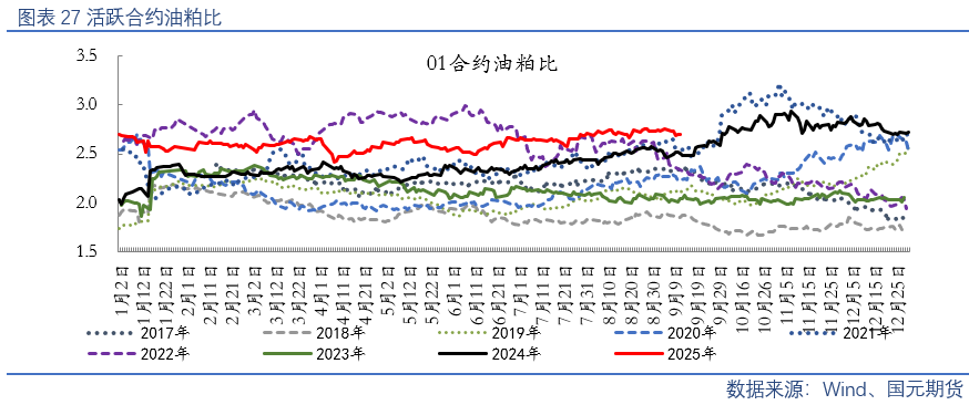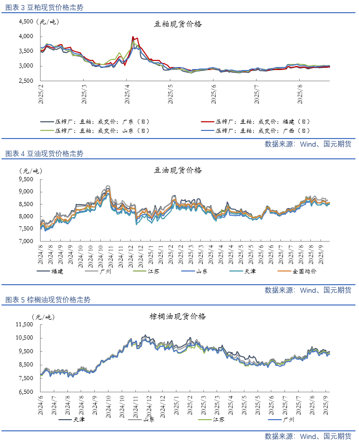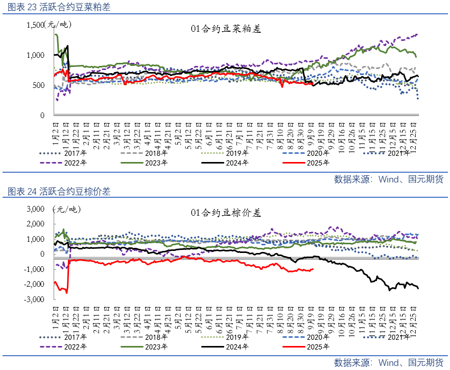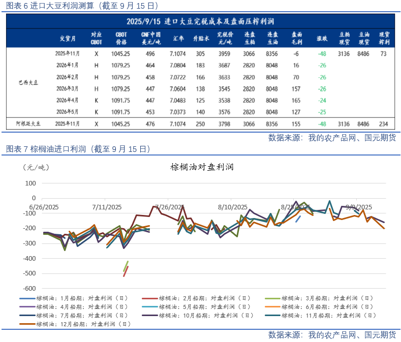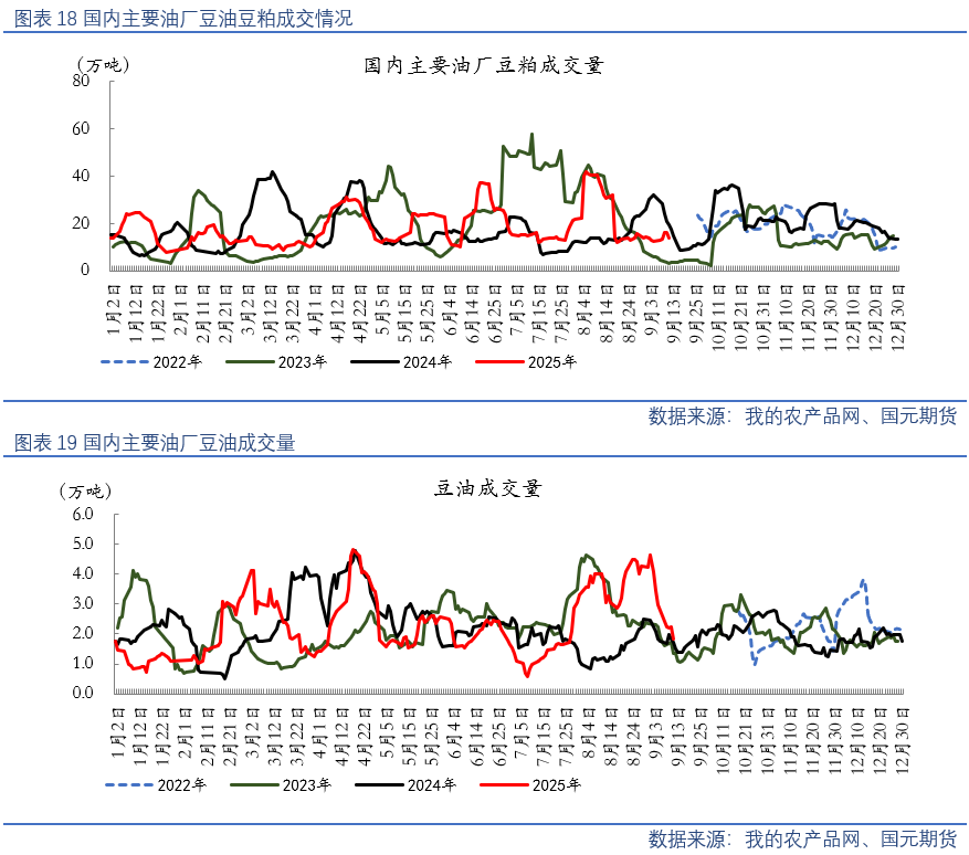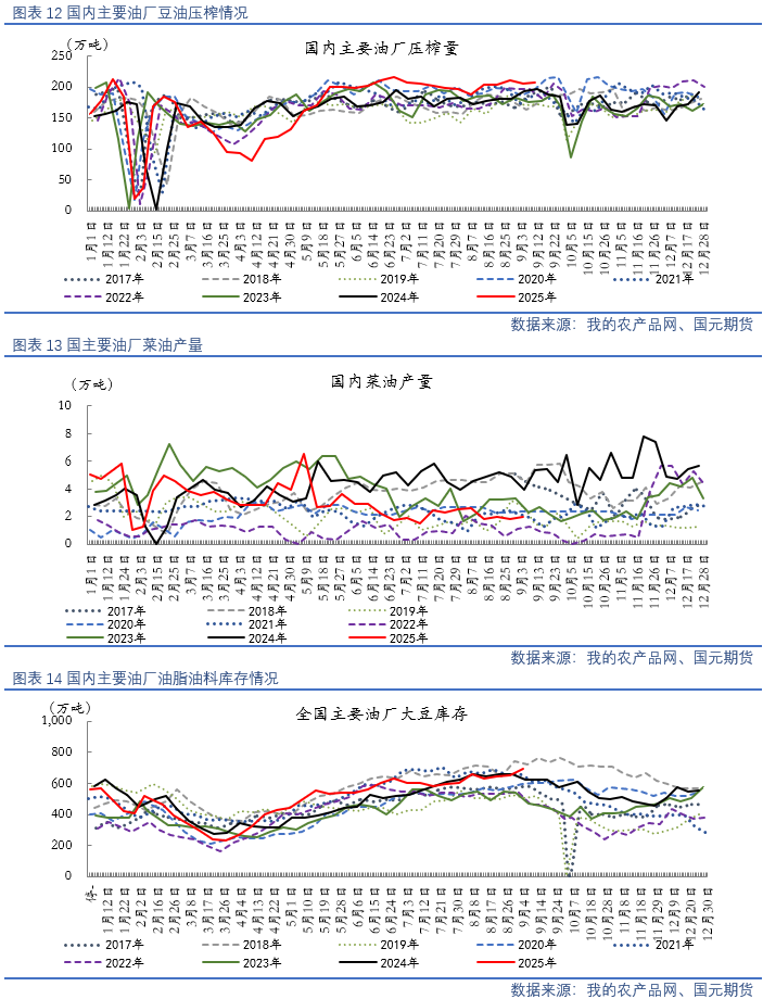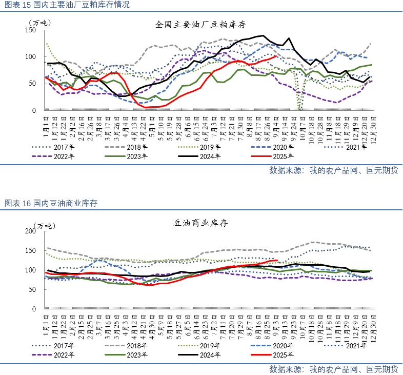 国内供需:海关数据显示9月国内大豆进口仍维持高位。根据周度数据显示,国内油厂压榨开机率保持相对稳定,豆粕产出充裕;下游饲料企业采购节奏平缓,养殖端需求暂无明显增量,豆粕库存延续累库趋势,市场去库压力仍存。