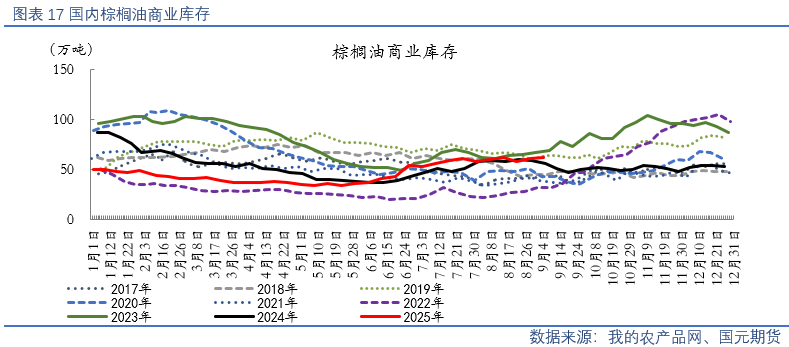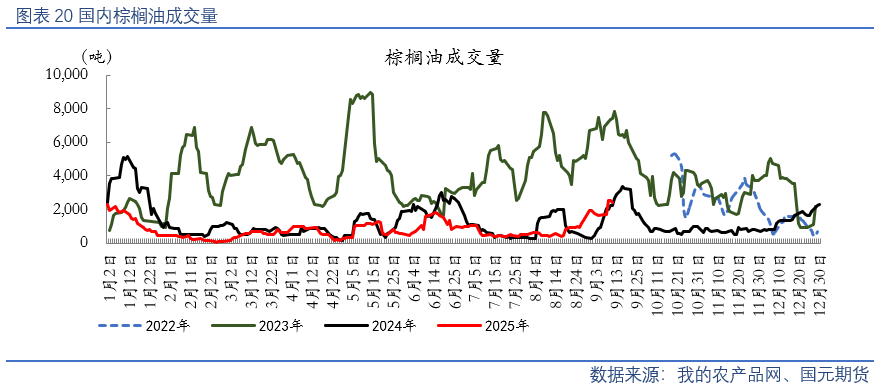 【MPOB:8月底马来西亚棕榈油库存创近20个月新高】马来西亚棕榈油局(MPOB)数据显示,2025年8月,马来西亚棕榈油库存连续第六个月增长,达到220万吨,为近20个月以来最高水平,符合市场预期;毛棕榈油产量185.5万吨,环比增加2.35%,为连续第二个月增长;出口量132.5万吨,同比下降0.29%。