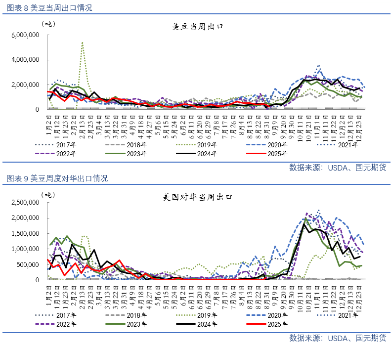 【出口销售报告:2025/26年度迄今美国大豆销售总量同比减少34.3%】美国农业部周度出口销售报告显示,截至9月4日当周,2025/26年度美国大豆净销售量54.1万吨,此前一周为81.9万吨;2025/26年度美国大豆销售总量935.4万吨,高于一周前的804.6万吨,但比去同期的1424.5万吨减少34.3%。