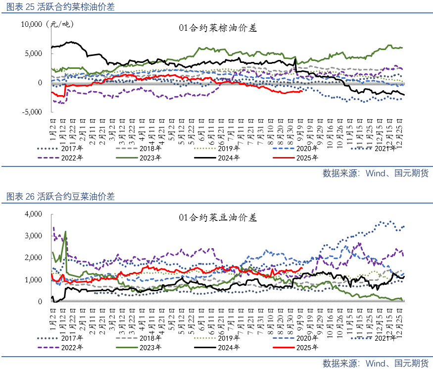 【棕榈油】MPOB8月供需报告中性偏空,马棕产量和库存数据与市场预期基本吻合,但出口却明显低于预期。另外,根据独立检验公司AmSpec Aar发布数据显示,马来西亚2025年9月1-10日棕榈油产品出口量较上月环比下滑8.4%。增产周期内,由于上半年降雨很好,9-10月马棕产量大概率也是偏高水平,马棕供需压力有所增加。
