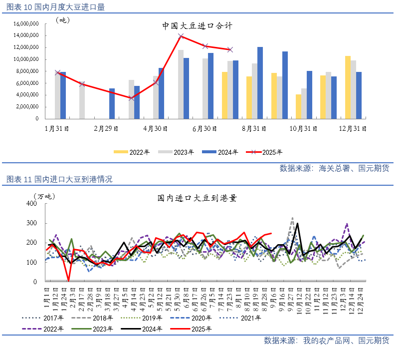 【8月我国进口大豆1227.9万吨创历史同期新高】海关数据显示,2025年8月我国进口大豆1227.9万吨,环比增加61.3万吨,同比增加13.5万吨,增幅1.1%;1-8月我国累计进口大豆7331.2万吨,同比增加283.3万吨,增幅4.0%。2024/25年度迄今我国累计进口大豆9649.9万吨,同比增加311.5万吨,增幅3.3%;作为对比,2023/24年度我国进口大豆1.05亿吨,创历史新高。