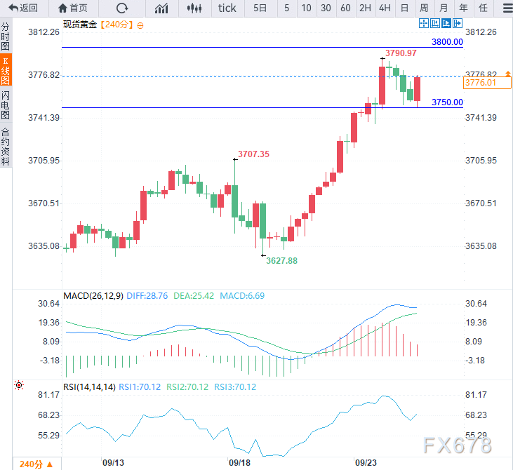 上行方面,现货黄金多头或需等待金价有效突破并站稳3800美元整数关口后,才可能确认延续近一个月来的既定上涨趋势,进而上探3900美元。