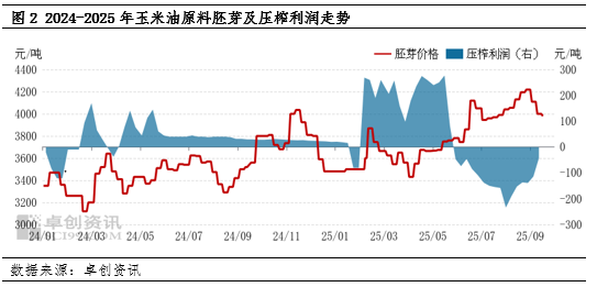 卓创资讯认为,进入9月后原料玉米胚芽价格持续下跌,是油厂亏损减轻的主要原因。新季玉米上市量不断扩大,华北及华东地区玉米深加工企业开机率持续上升,玉米胚芽供应量不断增加。以淀粉为例,全国玉米淀粉开机率由8月末的52.71%上升至57.43%,涨幅4.72个百分点。在消费端,因双节食用油备货基本结束,下游进入到阶段性需求淡季,油厂采购原料胚芽的积极性不高,带动胚芽价格走低。下游偏淡的需求不利于玉米油支撑玉米油价格。