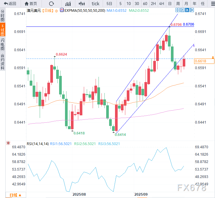 上行方面,澳元/美元正测试其近期阻力位0.6625附近的上升通道下轨。若价格重新回升至通道内,将巩固短期上涨动能,并推动汇价逼近9月17日创下的11个月高点0.6707,继而挑战0.6730附近的通道上轨。