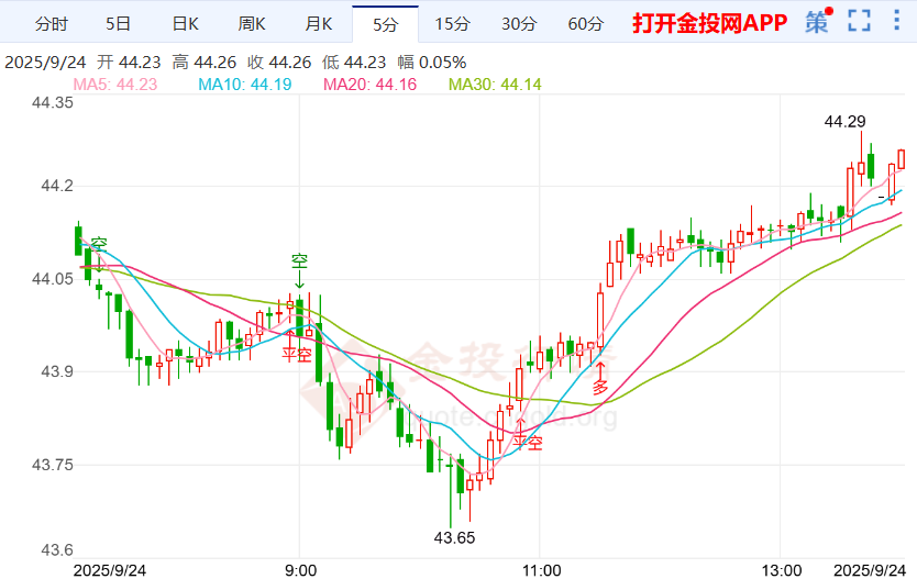 今日周三(9月24日)亚盘时段,国际白银目前交投于44.13一线上方,今日开盘于43.97美元/盎司,截至发稿,国际白银暂报44.25美元/盎司,上涨0.61%,最高触及44.30美元/盎司,最低下探43.64美元/盎司,目前来看,国际白银盘内短线偏向看涨走势。