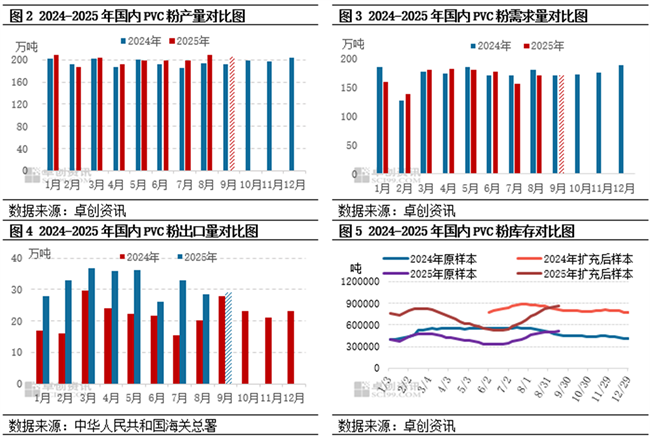 库存持续增加的主要原因从供应端来看因为供应端开工相对偏高,而且福建万华50万吨新装置在8月份量产,渤化发展40万吨新装置9月份量产,PVC行业整体产量居高不下,据卓创资讯统计,三季度PVC粉产量预估在610.32万吨,较二季度增加3.44%,较去年三季度增加6.66%。