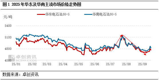 7月份随着“反内卷”政策升温,以焦煤、多晶硅、碳酸锂等领涨产品提振商品指数,PVC期货受情绪带动价格上涨,带动现货价格走高。8-9月份随着“反内卷”降温,商品价格回落,PVC粉重回基本面逻辑,价格很快回到年内低位。