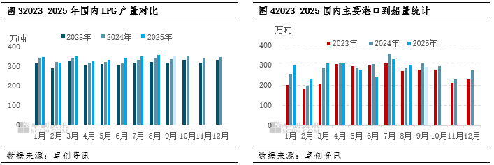 从“2023-2025年国内LPG产量对比”图可知,受2025年前期装置检修影响,国内LPG供应较2024年有一定回落。不过,进入6月后,国产气产量出现明显增长。截至9月18日,国内液化气产量达224.09万吨,较上月同期增加6.64万吨,日均产量增加3500吨。商品量方面,据卓创资讯数据,本周(截至9月18日)国内液化石油气平均商品量为53675吨/日,较上期增加448吨/日,增幅0.06%。综合来看,预计9月国内LPG产量及商品量均较上月有所增加。进口气到港量方面,卓创资讯统计数据显示,截至目前,9月预估到港量为291.41万吨,较8月减少10.72万吨,较2024年同期减少18.14万吨。
