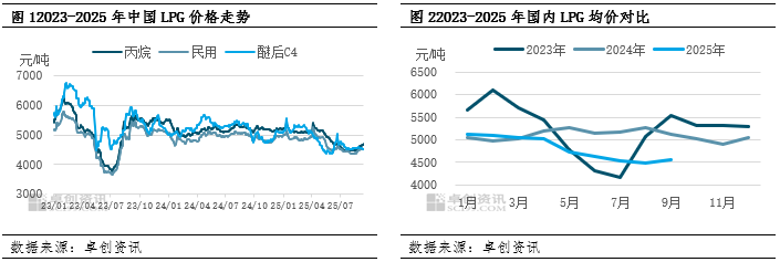 2025年1-9月,中国LPG价格整体呈现震荡下行后逐步企稳的态势。从“2023-2025年国内LPG均价对比”与“2023-2025年中国LPG价格走势”图可见,丙烷、民用以及醚后C4等不同品类的LPG价格,年初虽有波动,但整体从相对高位逐步回落,年中基本在4000-5000元/吨区间震荡。截至9月18日,本周国内全国民用气价格4508元/吨,全国醚后碳四价格4452元/吨,民用及醚后碳四价格较前期有所回落;国内丙烷市场延续上涨,本周四国内丙烷市场均价达4728元/吨,较上周四上涨63元/吨,涨幅1.35%。